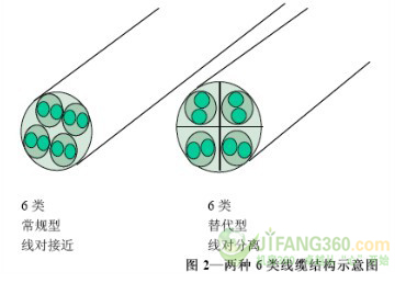 一个6类标准信道应被设计为比5类标准信道具备更低信号衰减和更优的近端串扰特性。更低的信号衰减可通过使用稍重一些规格的铜介质线缆来实现,既直径在0.5mm(24AWG)至0.6mm(23AWG)之间的线缆。现有两种可供选择的线缆包括在TIA的6类标准草案说明书考虑范围之内。在100MHz带宽下这两种6类线缆的信号衰减比5类线缆的信号衰减分别低了近2分贝和4分贝。同样在100MHz带宽下两种6类线缆分别比5类线缆的近端串扰降低了将近12至18分贝。这两种6类线缆的描述如下图2。