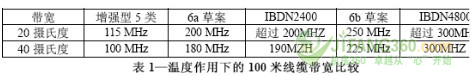 线缆的信号衰减受温度的影响很大。温度每升高10个摄氏度,线缆的信号衰减就增大4%。这意味着40摄氏度下92.6米线缆的信号衰减与20摄氏度下100米线缆的信号衰减相同。所以,温度对于信号衰减的影响及作用要远远大于许多其它的固定因素。温度对于带宽的影响是如此显著。表1比较了增强型5类标准布线系统与6类标准布线系统在不同温度下的带宽值。