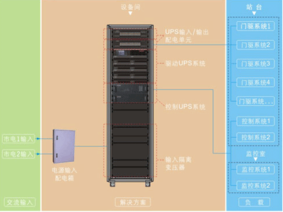 方案的特点: 1、 专点专用、独立运作 分别使用驱动UPS系统和控制UPS系统位屏蔽门驱动系统和控制系统独立供电,互不影响。 2、 独立配置外部设备 独立配置输入隔离变压器等外部设备,结构清晰,功能独立。 系统原理图 电气原理图: